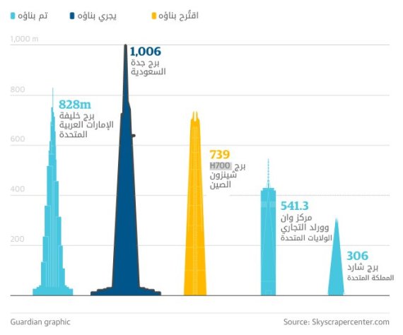 وسيصل ارتفاع برج جدة إلى كيلومتر حين يكتمل بناؤه عام 2020، ما سيجعله أطول مبنى في العالم.