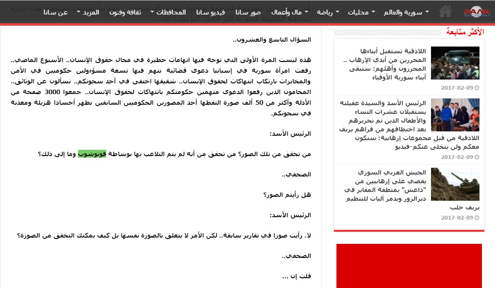 سوريا كلها فوتوشوب …..كل حياة العلوي فوتوشوب ..حياتهم كلها هامش ومن 50 سنة يحاولون ان يظهروا انهم ذو شان ولكن والله كله وهم واجرام والدليل القتل والكذب والقبضة الشمولية ..لم يستطيعوا في حياتهم ان يقدموا سوى الكذب والسرقة والدمار …سوريا اصبحت مكسر عصا على عهدم .. لحتى وصلنا الى ماوصلنا ..هل هذا الطائفي المجرم دكتور …والله لو تم ربط حمار في اي كلية في العالم لاستطاع ان يفهم ويقدر اكثر منه ..انه رمز الدولة العميقة …واداة التنفيذ الرخيصة…. وبالع حبة البث المباشر…. يدفع للصحفي من اجل ان يكذب فقط ليس الا ..هو لا يهمه ..ما يقول وماذا يفعل لانه مرخض له ان يقتل …. سبحانك ربي …لابد لليل ان ينجلي وهذا المجرم ان ينقلع ….