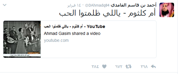 غرد الشيخ الدكتور أحمد الغامدي، رئيس هيئة الأمر بالمعروف والنهي عن المنكر بمنطقة مكة سابقًا على صفحته بموقع التواصل الإجتماعي ” تويتر ” بقطع فيديو لأغنية “يا اللي ظلمتوا الحب” لأم كلثوم في إطار رصده جميع الأدلة من الكتاب والسنة التي توضح إباحة الأغاني والاستماع إلى المعازف.