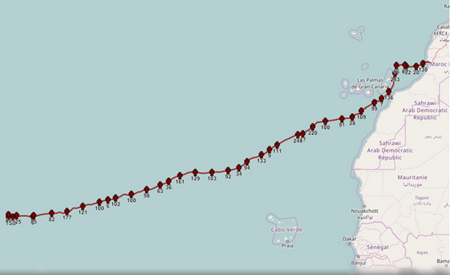 وفي حال نجح البحار القادم من جنوب أفريقيا في مسعاه، سيسجل أكثر من 750 كم منذ بداية رحلته، يوم 6 ديسمبر/كانون الأول، من أغادير في المغرب.