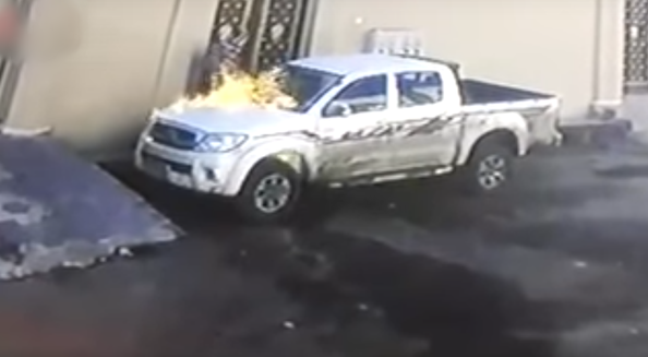 وبين المقطع الذي صور من كاميرا مراقبة من منزل مقابل لمنزل صاحب السيارة، الشخص الملثم يقترب في حذر نهاراً، حتى وصل إلى السيارة وحرص أن يكون قريباً منها للغاية، خاصة مقدمتها، وقام بسكب البنزين على مقدمة السيارة وصولاً إلى داخل الماكينة، ومن ثم أشعل النيران التي انتشرت بكثافة عالية بدءاً من المقدمة وفق ما نقلت قناة العربية ، وبسرعة شديدة لم يتوقعها هو نفسه، حيث كان قريباً للغاية من جسم السيارة ثم فرَّ هارباً.