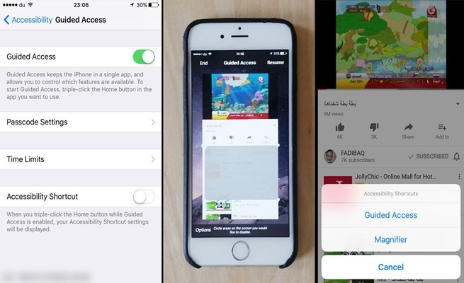 من قائمة الإعدادات Settings توجه إلى عام General ومن ثم Accessibility ثم في أسفل الشاشة اختر Guided Access وفي الصفحة التالية قم بتفعيل الخيار. ثم اضغط في نفس الصفحة على Passcode Settings لضبط كلمة المرور الخاصة بهذه الميزة، وهي مختلفة عن كلمة المرور الخاصة بالهاتف. كما يمكن استخدام البصمة أيضا بدلا من كلمة المرور.