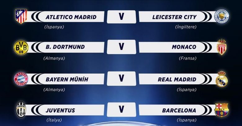 بينما وقع أتلتيكو مدريد الإسباني في مواجهة ليستر سيتي الإنجليزي، فيما اصطدم بوروسيا دورتموند الألماني بموناكو الفرنسي.