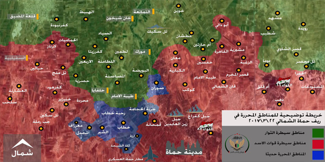 ↓ حماة : تراجع مستمر لميليشيات النظام .. قطع لطريق ” حماة – محردة ” و الريف يعلن منطقة عسكرية