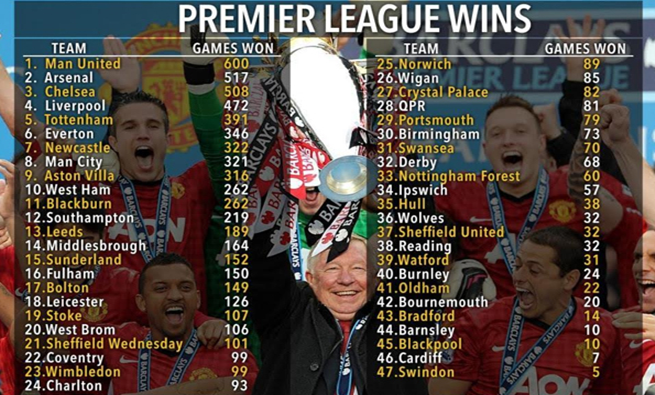 وتعكس الانتصارات الـ 600 التي حققها “الشياطين الحمر” هيمنته على مسابقة “البريميرليغ” عكس ما كان عليه الحال قبل إطلاق نسخة الممتاز، حيث يدين بالفضل لمدربه الأسطورة أليكس فيرغسون بعدما تزامن ذلك مع إطلاق الصيغة الجديدة للدوري وبلوغ المدير الفني الإسكتلندي الشهير مرحلة النضج كمدرب، وهو في عامه السادس بقلعة “الأولدترافورد” ليقود اليونايتد لاكتساح لقب الدوري قبل أن يعتزل صيف عام 2013، وهو على منصة التتويج.