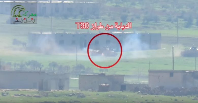 حماة : لحظة تدمير الجيش الحر دبابة ” T 90 ” لميليشيات النظام بصاروخ تاو على جبهة بلدة معرزاف ( فيديو )