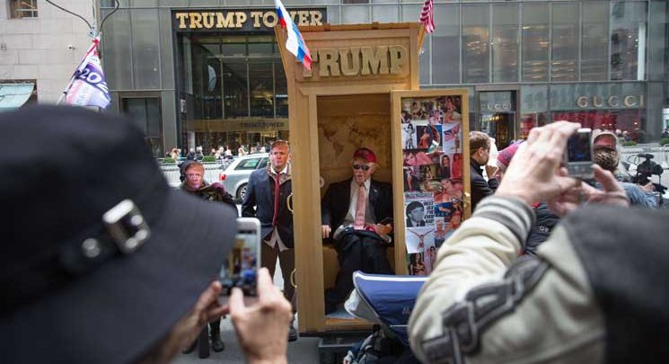 ومشى المشاركون في المسيرة، وقد ارتدى كثيرون منهم أقنعة تشبه وجه قطب العقارات الذي انتُخب رئيسا، خلف دمية بشكل ترامب تجلس على مرحاض وتم تسييرها على عربة تحمل العلمين الأمريكي والروسي.