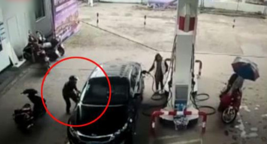 وظهر السارق في المقطع وهو يعتلي دراجة بخارية متوقفة في محطة وقود هادئة إلى جانب سيارة انشغلت مالكتها في ملء الوقود.