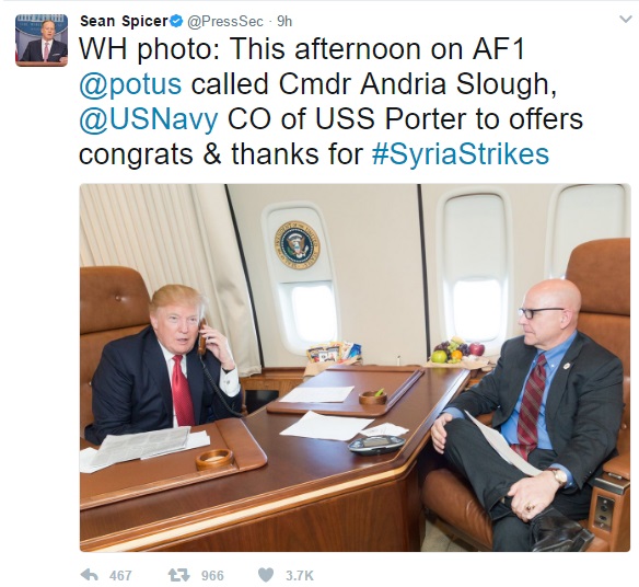 وقال سبايسر في تغريدة عبر حسابه على موقع “تويتر” إن ترامب “اتصل اليوم بقائدة البارجة بورتر (الصورة)، لتهنئته وشكره على الهجوم”.