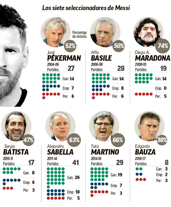حقق المهاجم ليونيل ميسي مع المدرب دييغو ارمندو مارادونا أعلى نسبة فوز في مسيرته مع المنتخب الأرجنتيني، التي انطلقت في صيف عام 2005، والتي عرفت تعاقب سبعة مدربين على الجهاز الفني لـ”التانغو” خلال هذه الفترة.