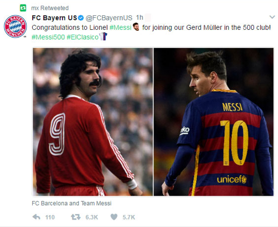 وقال بايرن في تغريدة عبر حسابه الرسمي في تويتر: “نهنئ ليونيل ميسي لانضمامه إلى غيرد مولر في نادي الـ500”.