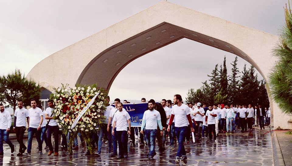 كان حينها طفلاً يلهو في القرداحة .. طلاب موالون من جامعة حلب يحتفلون بـ ” عيد الجلاء ” عبر زيارة قبر ” القائد المؤسس ” ! ( فيديو + صور )