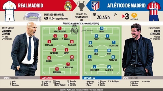 ينتظر عشاق الكرة حول العالم، اليوم الثلاثاء، مواجهة من العيار الثقيل تجمع بين بطل أوروبا #ريال_مدريد و غريمه #أتلتيكو_مدريد، ضمن منافسات ذهاب نصف نهائي #دوري_أبطال_أوروبا.