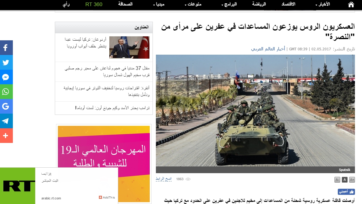 نشرت قناة “روسيا اليوم” الروسية، خبراً، اليوم الثلاثاء، بعنوان “العسكريون الروس يوزعون المساعدات في عفرين على مرأى من النصرة”.