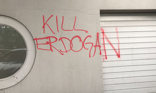 سويسرا : ملثمون يعتدون على القنصلية التركية في زيوريخ و يكتبون على جدرانها ” اقتلوا أردوغان “