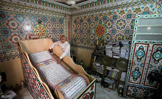 محمد الذي تغطي جدران وأسقف بيته في بلقينا، إحدى قرى مركز المحلة في محافظة الغربية بدلتا مصر، الزخارف الإسلامية المرسومة باليد، نسخ القرآن على لفة ورق طولها 700 متر.