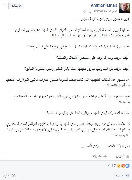 ويضيف: “كيف سنعرف من أعطى موافقة السفر الخارجي لهدى السيد معاونة وزير الصحة المعفاة من منصبها؟ هل هناك شركاء لهدى السيد ما زالوا بالمناصب يمارسوا فسادهم؟”.