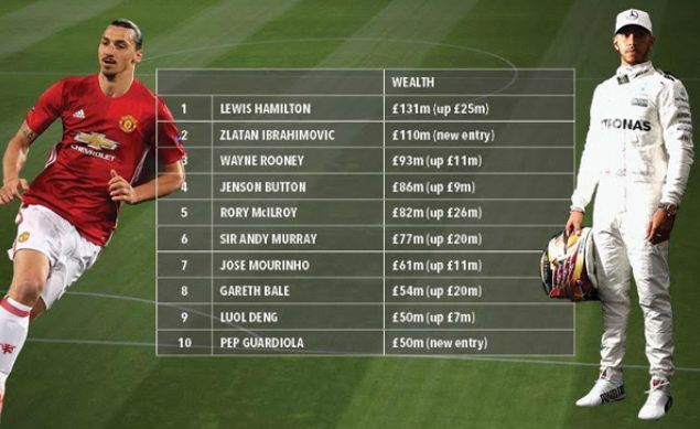 وحل ثانياً النجم السويدي المخضرم زلاتان إبراهيموفيتش مهاجم نادي مانشستر يونايتد الإنكليزي كأحد الأثرياء الجدد في الرياضة في بريطانيا بثروة تقدر قيمتها بـ 110 ملايين باوند استرليني ليكون اغنى لاعب كرة في بريطانيا متفوقاً على زميله في الفريق الإنكليزي واين روني، الذي جاء في المركز الثالث رغم ارتفاع ثروته إلى 11 مليون باوند استرليني لتصل في العام الجاري إلى 93 مليون جنيه .