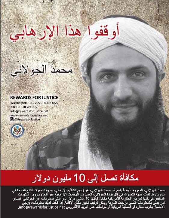 أمريكا ترصد مكافأة ضخمة لمن يدلي بمعلومات عن ” أبو محمد الجولاني “