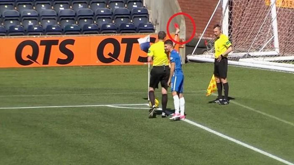 فقد وجه حكم المباراة كريغ تومسون بطاقة حمراء إلى مساعده أندي ماكويليم “حكم الراية”.