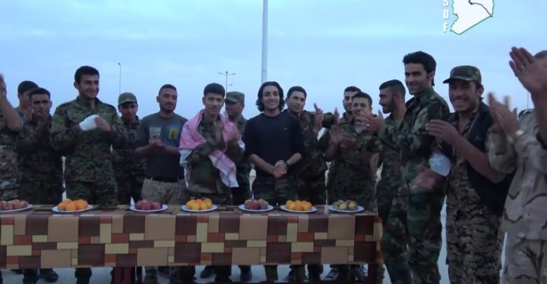 ويظهر في الفيديو، الناطقة الرسمية باسم حملة تحرير الرقة ” جيهان شيخ أحمد ، إلى جانب عدد من العناصر الذين يرقصون على أنغام الأغاني الشعبية.
