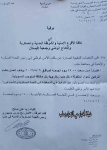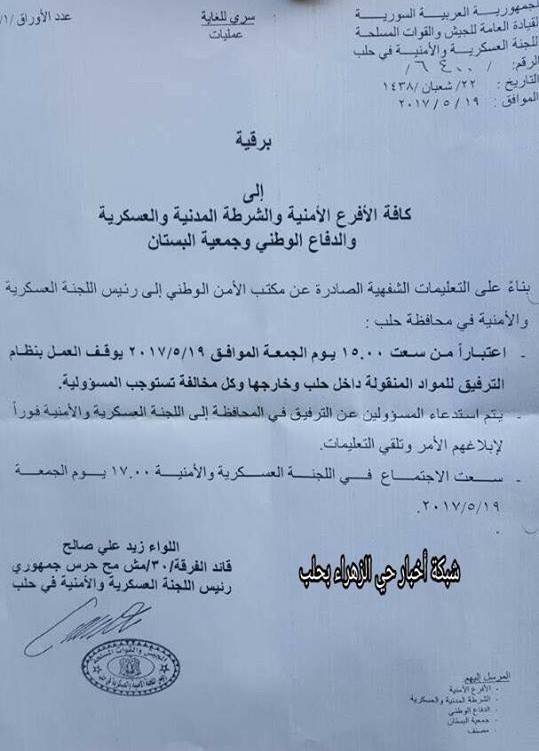 وتناقلت صفحات وشبكات إخباري موالية عبر مواقع التواصل الاجتماعي صورة للقرار الصادر عن صالح، وجاء فيه: “بناء على التعليمات الشفهية الصادرة عن مكتب الأمن الوطني إلى رئيس اللجنة العسكرية والأمنية في محافظة حلب: اعتباراً من الساعة 15.00 يوم الجمعة الموافق19/5/2017، يوقف العمل بنظام الترفيق للمواد المنقولة داخل حلب وخارجها، وكل مخالفة تستوجب المسؤولية”.