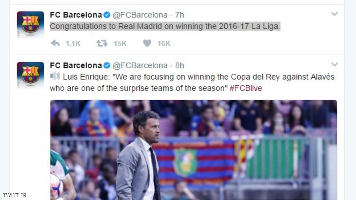 و بحسب ما اوردت قناة سكاي نيوز غرد برشلونة عبر حسابه الرسمي على موقع “تويتر” قائلا : “تهانينا لريال مدريد على فوزه بلقب الليغا لموسم 2016-2017″، في لقطة لافتة بين ألد غريمين في أوروبا والعالم.