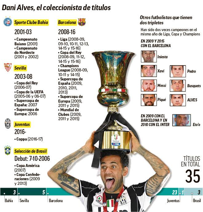 وباستثناء لقب كأس العالم، فإن ألفيس توّج بجميع البطولات التي خاضها في مشواره الثري، إذ فاز مع ناديه الأصلي باهيا البرازيلي بثلاثة ألقاب ، ثم انتقل إلى إسبانيا للعب مع نادي إشبيلية وأحرز بألوانه خمسة ألقاب، ثم انتقل بعدها إلى نادي برشلونة ليلعب معه من عام 2008 وحتى عام 2016 ويحرز بقميصه 23 لقبًا، منها إنجاز الثلاثية الذي حققه “البارسا” مرتين في انتظار الثالثة، وفق ما اوردت صحيفة إيلاف، ليكون أول لاعب يحقق هذا الانجاز وفي موسمه الأول مع نادي يوفنتوس، حيث حاز على لقبي الدوري والكأس .