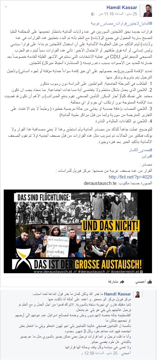 ونشر “حمدي كسار” الذي سبق له أن أجرى مقابلة (المقابلة الأسبوعية المعروفة) مع المستشارة الألمانية أنجيلا ميركل، عبر صفحته في فيسبوك، معلومات قال إنها “قرارات جديدة بحق اللاجئين السوريين في عدة ولايات ألمانية بانتظار تعميمها على المحكمة العليا لتصبح سارية المفعول في جميع الولايات( مع العلم بأنه تم البدء بتطبيق هذه القرارات في عدة ولايات) ليتم التأكيد من قبل الحكومة الألمانية على أن استقبال اللاجئين تم بناءا على قرارا سياسي وليس إنساني, أو أنه فوق طاقتهم, أو الاحتمال الأخير”.