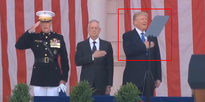 وأظهر فيديو تم تداوله على على نحو واسع، ترامب وهو يتراقص ويضرب يده على صدره ويغني مع النشيد، في حين شوهد وزير دفاعه جيمس ماتيس، ورئيس هيئة الأركان المشتركة الجنرال جوزيف دنفورد، وهما يقفان بصمت وجدية بجانبه.