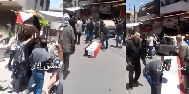 ونشرت شبكة أخبار “دمشق الآن” المخابراتية الأكبر في فيسبوك، مقطعاً مصوراً يظهر عدداً من الأشخاص وهم يدورون حول أنفسهم حاملين نعش أحد القتلى.