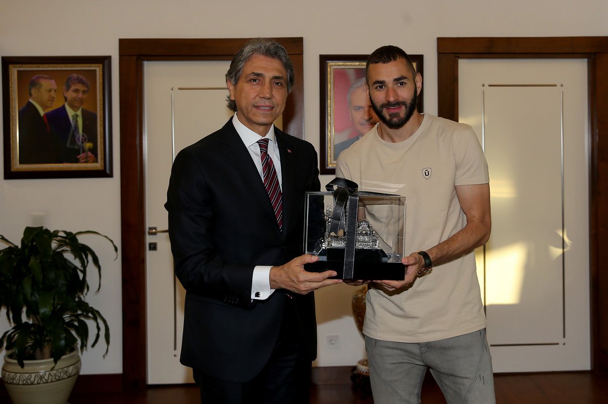 وأهدى رئيس البلدية لبنزيما نموذجاً مصغراً عن جامع “السليمانية” في إسطنبول، فيما قام المهاجم الفرنسي بإهدائه قميصاً لريال مدريد عليه توقيعه، وفق ما ذكرت شبكة الخليج أونلاين، وقبل جولته بالبلدية، زار بنزيما لاعب كرة القدم التركي السابق زكريا أق غول، الذي تعرض لحادث سير قبل 9 سنوات، وأصيب بالشلل في رجليه.