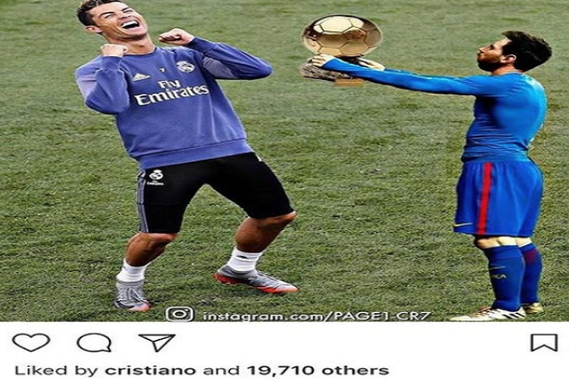 وفي خضم احتفالات ريال مدريد وجماهيره باللقب الأوروبي الغالي، قام أحد المعجبين برونالدو بنشر صورة على حسابه الخاص بموقع التواصل الاجتماعي “إنستغرام” يسخر من خلالها من ميسي الذي يسلم رونالدو جائزة الكرة الذهبية على طريقة احتفاله “الشهير” في الكلاسيكو الأخير.