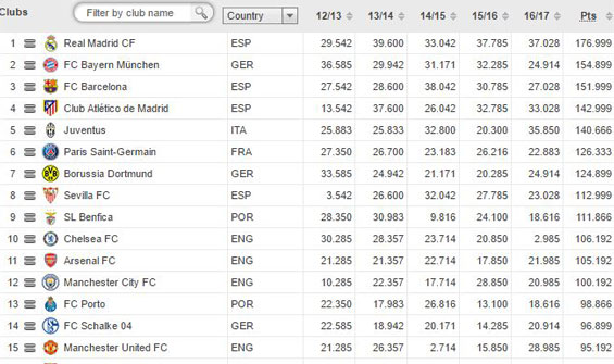 وتفوق الفريق “الملكي” على غريمه التقليدي برشلونة بعد فوزه بلقب دوري الأبطال موسم (2013-14) بمعدل بلغ 161.542 نقطة، إذ بلغ رصيده الحالي من النقاط 167.999، ليوسع الفارق مع أقرب ملاحقيه بايرن ميونخ الألماني.