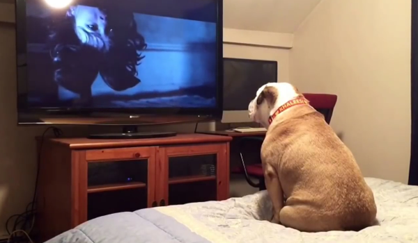 بالفيديو .. ” كلب ” يتابع فيلم رعب باهتمام بالغ