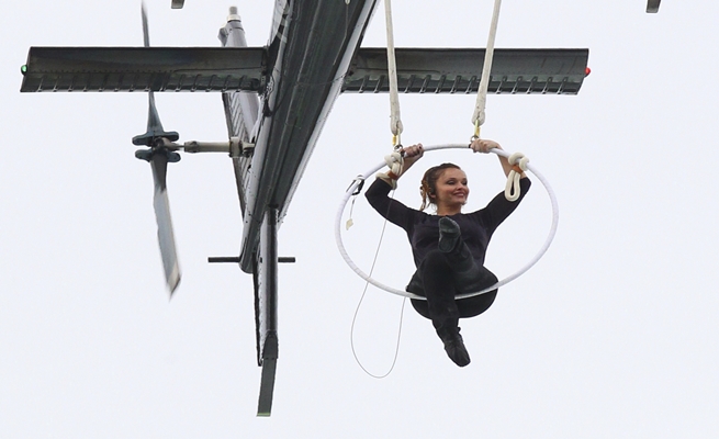 وأتى عرضها في الذكرى الخامسة لعبور زوجها على حبل مشدود شلالات نياغارا الواقعة على الحدود بين الولايات المتحدة وكندا.