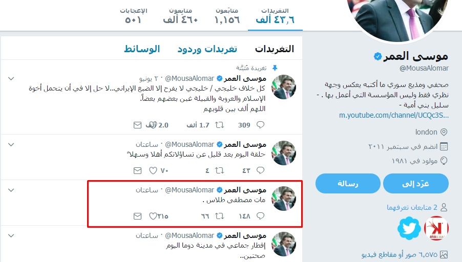 وفيما لم تنشر أية مصادر مقربة لطلاس، أو أية وكالة أنباء أو مصادر إعلامية فرنسية، تأكيداً أو نفياً لهذه الأنباء، غرد الإعلامي السوري موسى العمر عبر صفحته في تويتر، قائلاً: “مات مصطفى طلاس”.