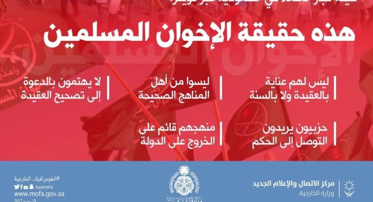 من جانبها نشرت وزارة الخارجية السعودية على صفحتها بموقع تويتر “انفوغراف” باللغتين العربية والإنجليزية يتضمن تغريدات هيئة كبار العلماء بالسعودية عن جماعة الإخوان.