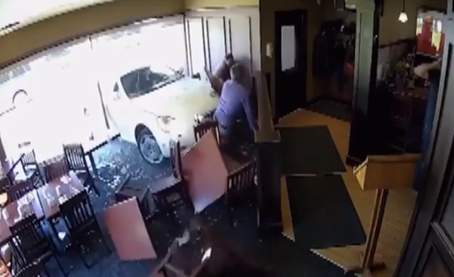 بالفيديو .. سيارة تقتحم مطعماً أمريكياً و تطيح برجلين