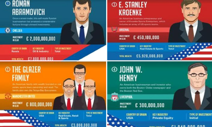 تصدر الثري الروسي #رومان_أبراموفيتش قائمة الأجانب الأكثر استثماراً في #الدوري_الإنكليزي الممتاز، الذي تحول منذ إطلاق نسخة الممتاز إلى سوق خصبة للأثرياء من مختلف الجنسيات لإنفاق أموالهم وتوظيفها في مشاريع متعددة تدر عليهم أرباحاً طائلة تعزز من ثرواتهم ومن تواجدهم في الملاعب الإنكليزية، مما ساهم في انتقال ملكية هذه الأندية للأثرياء الأجانب.