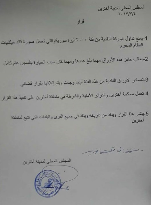 الرئيسية/ورد الآن/المجلس المحلي في أخترين بريف حلب يمنع تداول العملة الجديدة (2000 ليرة) – بيان المجلس المحلي في أخترين بريف حلب يمنع تداول العملة الجديدة (2000 ليرة) – بيان 5 يوليو، 2017 شاركها فيسبوك X لينكدإن واتساب تيلقرام ڤايبر نسخ الرابط تم نسخ الرابط 5 يوليو، 2017 شاركها فيسبوك X لينكدإن واتساب تيلقرام ڤايبر شاركها فيسبوك X لينكدإن واتساب تيلقرام ڤايبر
