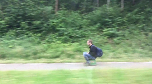 ويظهر الفيديو الرجل وهو يجلس على صندوق وينطلق به على طريق فرعي في منطقة مليئة بالأشجار والخضرة، بالقرب من منطقة ليمبورغ الهولندية.