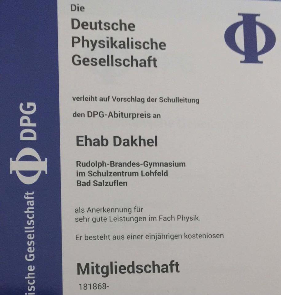 وكان التكريم عبارة عن “عضوية في الجمعية الألمانية للفيزياء”، وقد أشاد مدير المدرسة وعمدة المدينة خلال الاحتفال بإمكانيات السوريين الشبان وطموحاتهم.