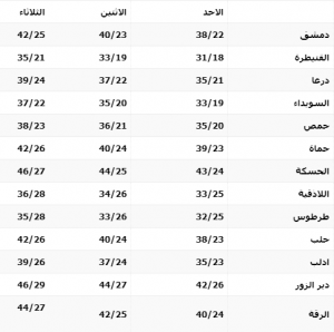 ومن المتوقع أن تصل درجة الحرارة في دمشق إلى 42 درجة مئوية، فيما تصل في بعض المناطق الشرقية والجزيرة والبادية إلى 47 درجة.