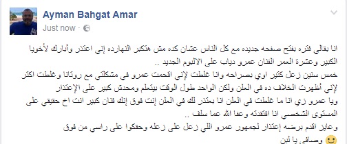 أيمن بهجت قمر الذي قدم مع الهضبة كما يلقبه جمهوره عددا من الأعمال التي لا تنسى أبرزها “بعترف – كده عيني عينك”، أعلن عن اعتذاره عبر حسابه على “فيسبوك”، وفق ما نقلت قناة العربية، حيث أكد على كونه منذ فترة وهو يحاول فتح صفحات جديدة مع الجميع، لذلك لن يتكبر اليوم عن الاعتذار لعمرو دياب.