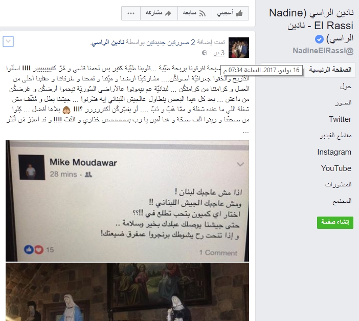 عالحالتين نصيحة افرقونا بريحة طيّبة …قلوبنا طيّبة كتير بس لحمنا قاسي و مُرّ كتيييييييير !!!! اسألوا التّاريخ والحَقوا جغرافيّة أصولكُن…. مشاركينّا أرضنا و ميِّتنا و قمحنا و طرقاتنا و عقلبنا أحلى من العسل و كرامتنا من كرامتكُن … لبنانيّة عم بيموتوا عالأراضي السّوريَة تيحموا أرضكُن و عَرضكُن من داعش … بعد كل هيدا البعض يتطاول عالجيش اللبناني إيه فشَرتوا … جيشنا بطل و مُثَقّف مش شغلة اللي ما عنده شغلة و ممّا هَبّ و دَبّ …. أو بفسِّركُن أكتررررر ؟!!!