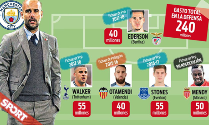 وكان غوارديولا قد تعاقد الصيف المنصرم مع المدافع الإنكليزي جون ستونز من نادي إيفرتون مقابل 55 مليون يورو، بحسب ما ذكرت صحيفة إيلاف، وأيضاً المدافع الأرجنتيني نيكولاس أوتامندي، الذي استقطبه النادي قبل مجيء غوارديولا في صيف عام 2015 مقابل 40 مليون يورو من نادي فالنسيا الإسباني .