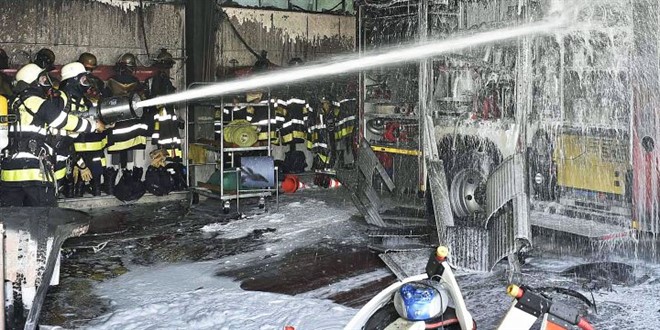 وتسبب الحريق بأضرار بالغة بثلاث عربات إطفاء ومعدات حماية.