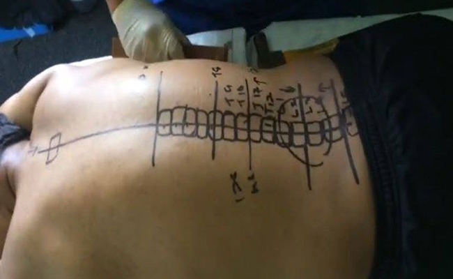 ووفقاً للمقطع الذي أوردته شبكة إرم نيوز، يقوم المعالج رصدي حسن، برسم خطوط على الظهر “تُوضح أماكن العظام”، وفي الخطوة الثانية يضع قطعة من القماش على مكان الألم، ويثبت عليها كتلة خشبية طرقها عدة مرات بالمطرقة، زاعماً أنها تصحح وضعية عظام الظهر، وتزيل الألم.