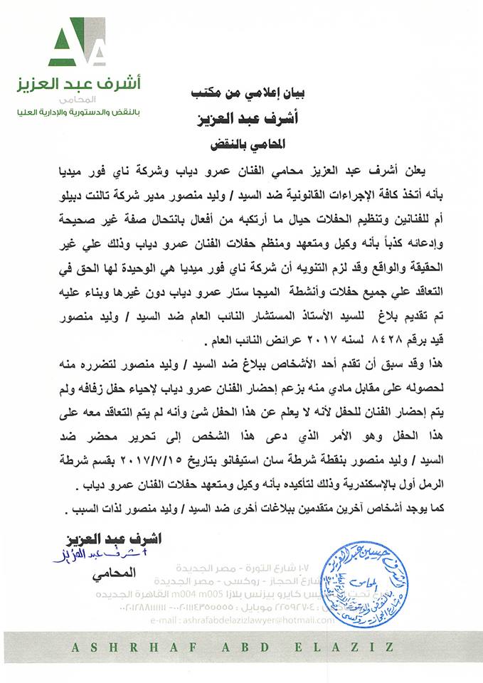 وقد أعلن أشرف عبد العزيز، محامي عمرو دياب وشركة “ناي فور ميديا”، عن اتخاذه كافة الإجراءات القانونية ضد وليد منصور، بسبب انتحاله صفة غير صحيحة وادعائه كذبا بأنه وكيل ومتعهد ومنظم حفلات عمرو دياب، وهو أمر غير صحيح.